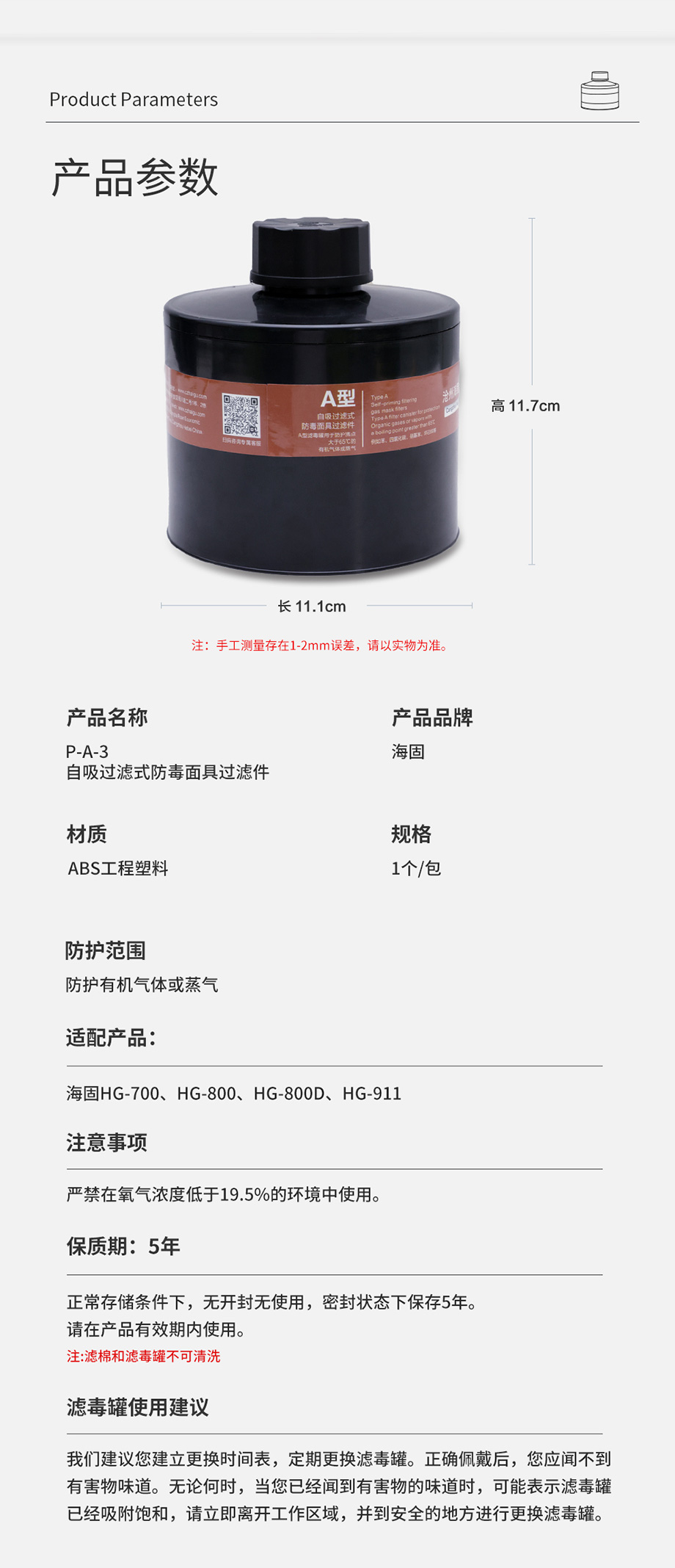 產(chǎn)品規(guī)格:ABS濾毒罐